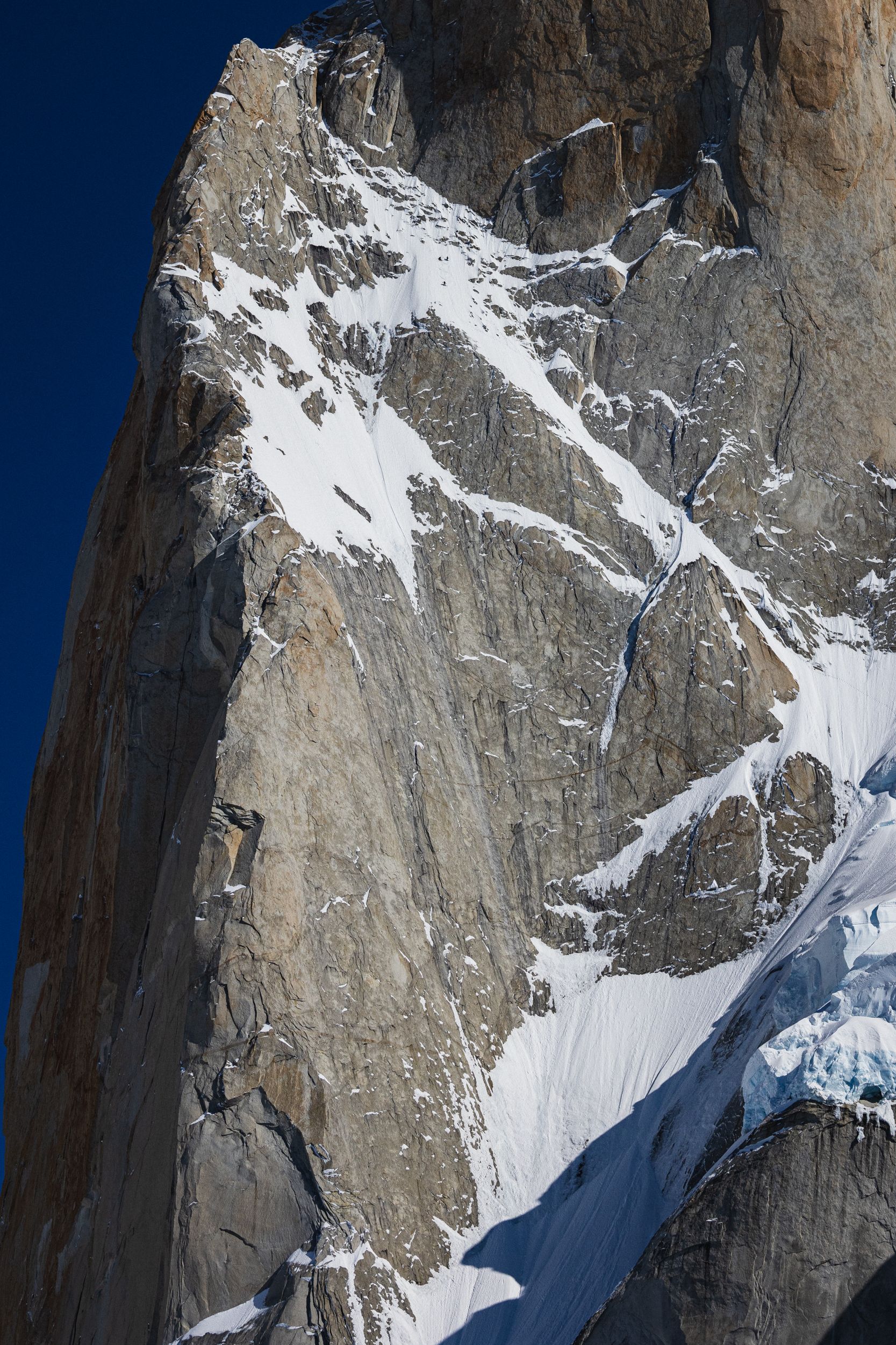 Mais les conditions étaient réunies pour la voie Whillans-Cochrane : une mince bande de neige, inclinée à 60° sur l'Aiguille Poincenot. Après un réveil sur les coups de 3 heures du matin, la cordée a pris la direction de cette ligne aussi esthétique qu'engagée, à flanc de falaise.