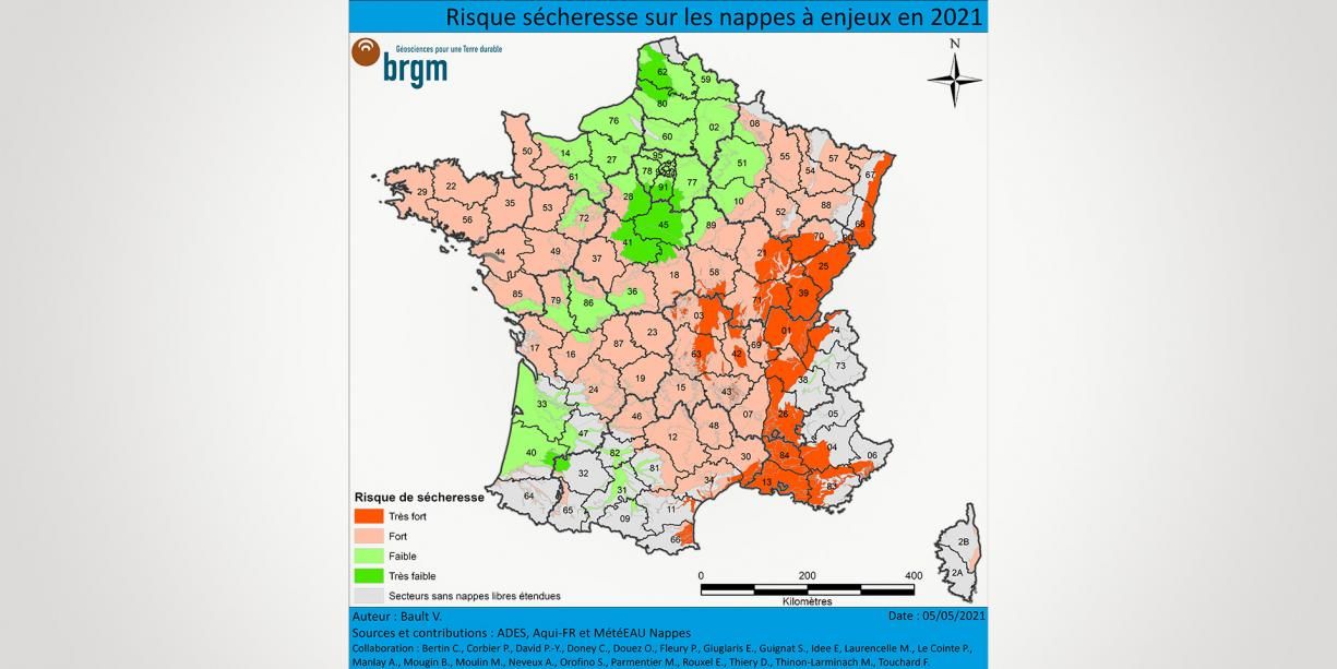 L'élaboration de la carte du risque sécheresse repose sur l'état initial des nappes après la période de recharge hivernale 2020-2021 (bulletins de situation des nappes au 1er avril et au 1er mai 2021), sur les prévisions disponibles jusqu’en septembre 2021 réalisées dans le cadre du projet Aqui-FR et issues des modèles MétéEAU Nappes ainsi que sur l’expertise d’hydrogéologues du BRGM.
