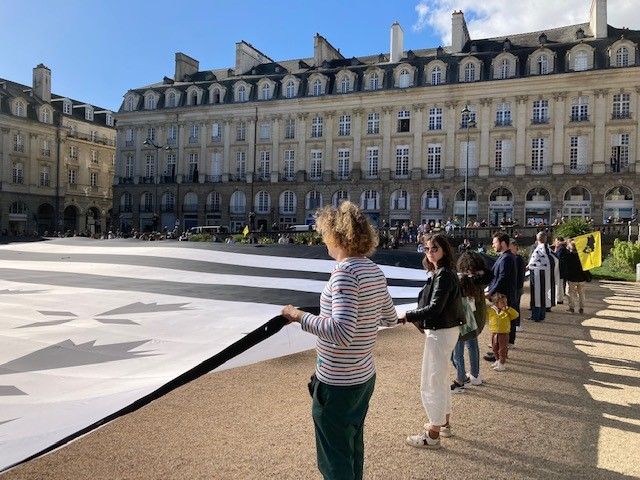 Un "gwenn ha du" géant pour alerter sur les enjeux de l'autonomie et de la réunification de la Bretagne. L'association "A la bretonne !" a déployé ce samedi 8 octobre à 14h30 sur la place du Parlement à Rennes un drapeau de 1400 m².