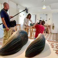 Perchée à 8m de haut sur une nacelle de chantier, devant la façade d'un centre commercial, la "street-artiste" rémoise Zekky, raconte le projet artistique démesuré auquel elle participe en cette dernière semaine de mai 2021 avec enthousiasme. Il s'agit de réaliser des fresques géantes. Une dizaine d'autres artistes de renommée nationale, peignent sur les murs du "Clos du Chêne", un immense centre commercial situé en Seine-et-Marne. Le duo féminin Mat et Zekky crée leur oeuvre sur un mur de 8m de haut et 6m de large. "Ce sera un tableau mythologique". À ses côtés, d'autres artistes réalisent différents tableaux géants, qui seront vus par 11 millions de personnes chaque année. Privées de lieux d'exposition depuis des mois à cause du covid-19, ces artistes revivent.