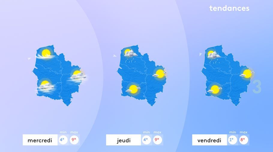 Vendredi : Le beau temps revient ! Toutefois il faudra attendre l’après-midi sur le nord de la région ou quelques averses matinales seront possibles. Le vent s’installera au nord-est, et sera faible à modéré, tandis que la masse d’air sera plus fraîche avec sans doute quelques gelées matinales puisque les minimales évolueront de -1 à 3°C. Au meilleur de l’après-midi il fera 7 à 9°C.