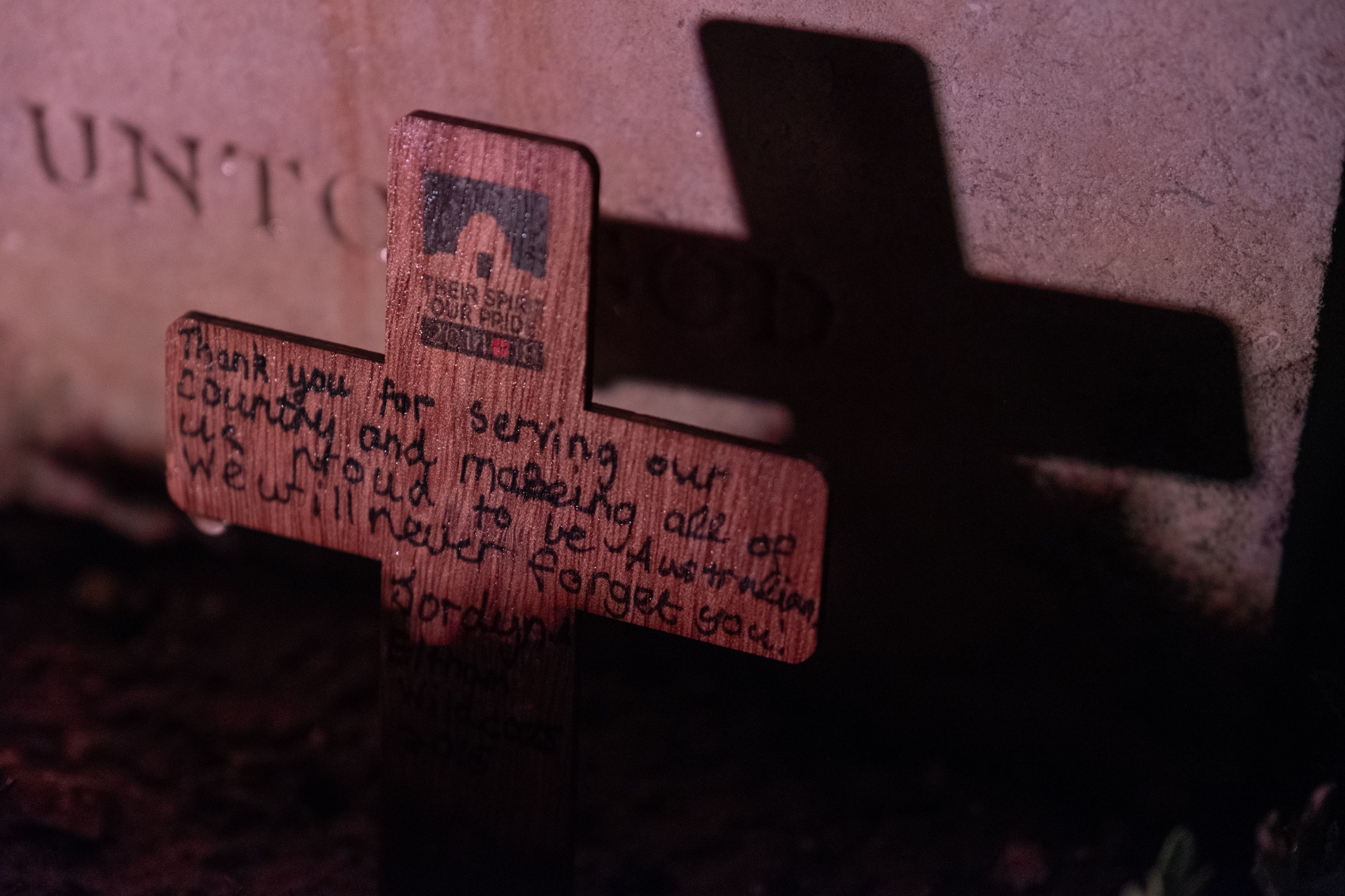 Le groupe prend place sur les chaises noires alignées devant le mémorial où les noms des 10 773 soldats australiens disparus pendant la Première Guerre mondiale sont gravés. Il est 4h30 du matin. La pré-cérémonie a déjà commencé. Quelques courts-métrages retraçant la vie de soldats sont projetés, les porte-drapeaux défilent puis les lumières s'éteignent.