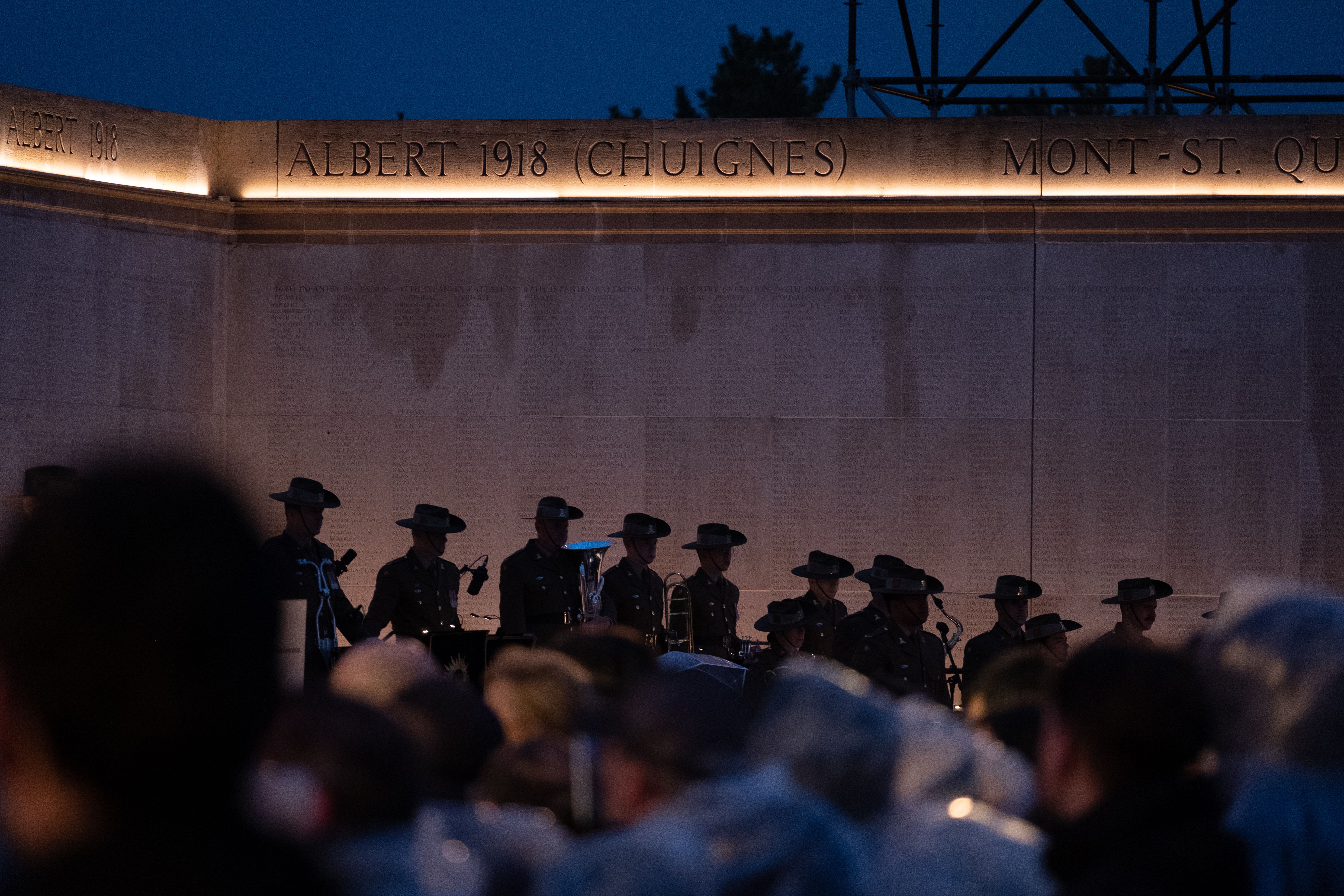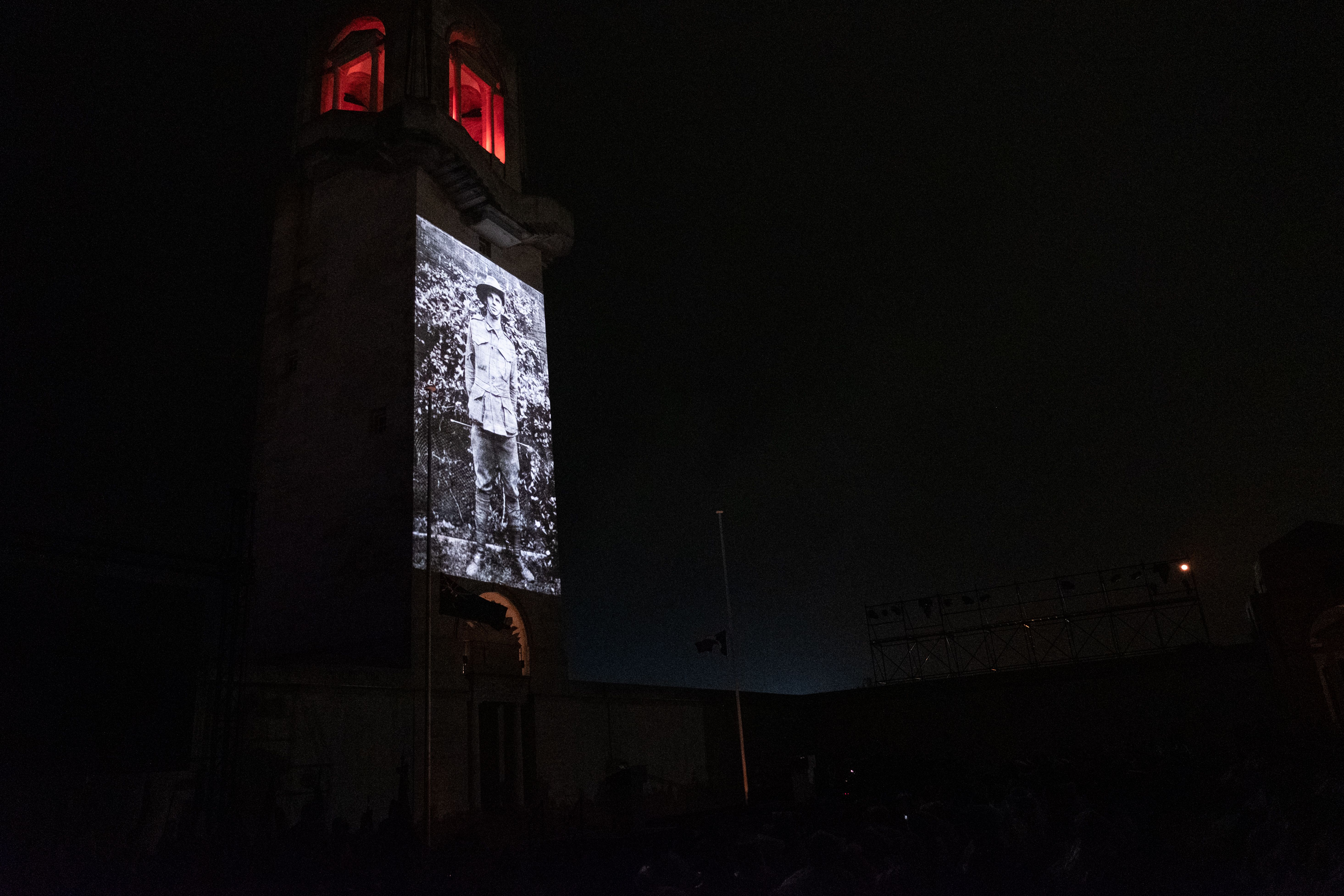 Les portraits de soldats australiens morts sur le front occidental sont projetés sur la Tour du Souvenir. Les photos défilent. Leurs noms, âges et postes sont lus par les membres de la Force de défense australienne. Des jeunes de 20 ans, mais aussi des maris et des pères âgés d'une trentaine ou d'une quarantaine d'années.