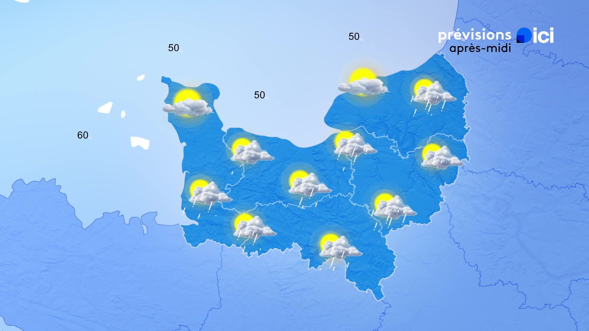 Dans l'après-midi le vent soufflera en rafales jusqu'à 60 ou 70 km par heure et des éclaircies alterneront avec des nuages parfois menaçants et même porteurs d'averses, des averses plus rares en bord de Manche. Comme les minimales, les maximales baisseront et il ne fera plus qu'entre 9 et 12°.