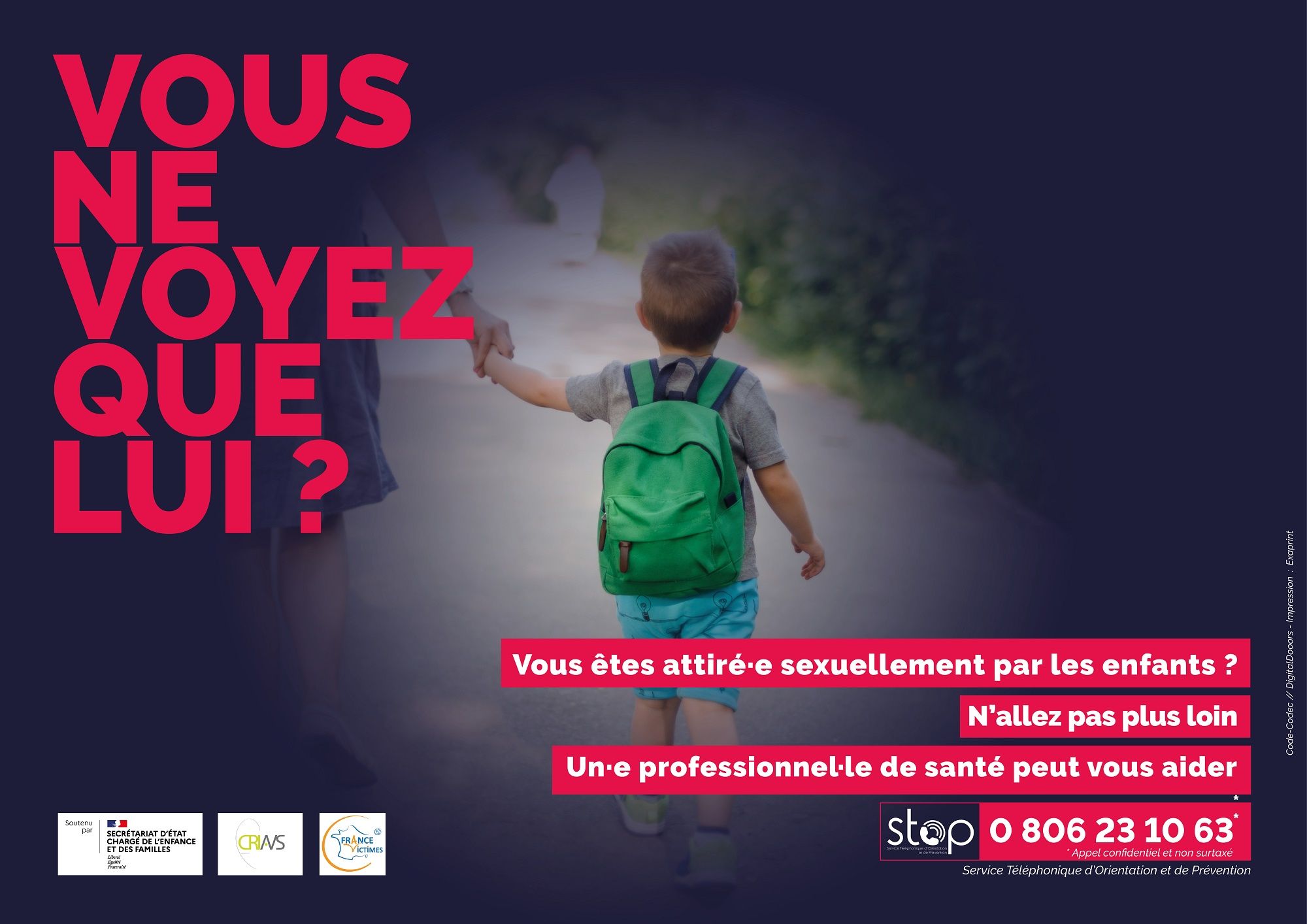Le dispositif a été baptisé STOP pour Service Téléphonique d’Orientation et de Prévention. Il s'agit d'une ligne d'écoute téléphonique (0 806 23 10 63) destinée à orienter vers des soins les pédophiles. D'abord utilisé à titre expérimental pendant un an dans quelques départements ce service vient d'être généralisé à l’ensemble du territoire national.